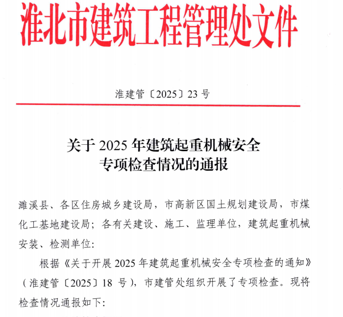 2025年7月21日,淮北市建筑工程管理處發(fā)布了2025年建筑起重機械安全專項檢查情況通報,淮海建工公司承建的悅溪杏林小區(qū)、狀元府兩個項目在安全管理制度健全、安全生產措施落實及建筑起重機械安全狀況良好等方面表現(xiàn)突出,獲得市建管處通報表揚的同時也為公司贏得了信用加分!